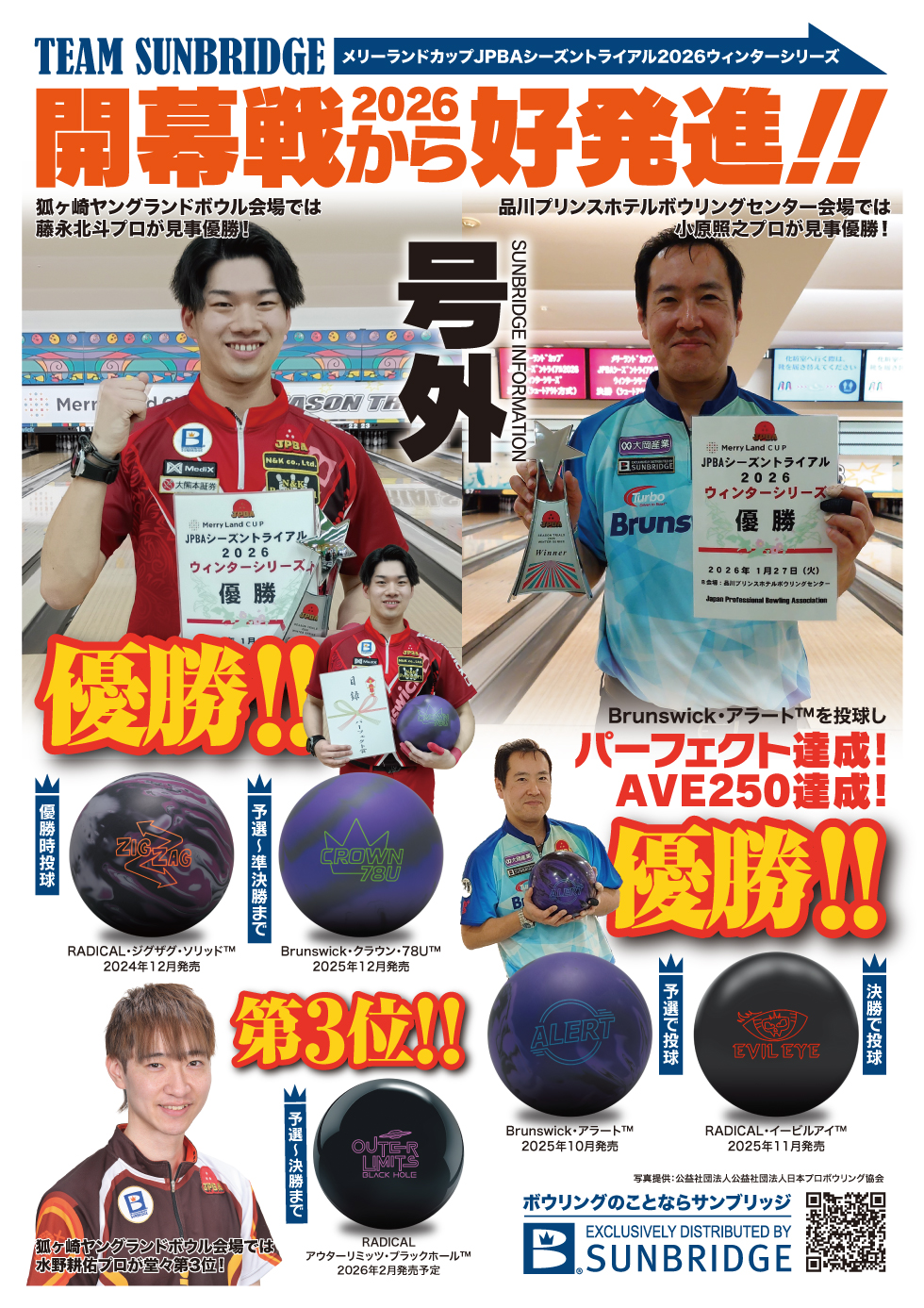 これらの結果は、選手たちの確かな実力とともに、Brunswick、DV8、RADICALなど、サンブリッジ取扱ブランドが持つ高いパフォーマンス価値が、結果として明確に示された大会となりました。